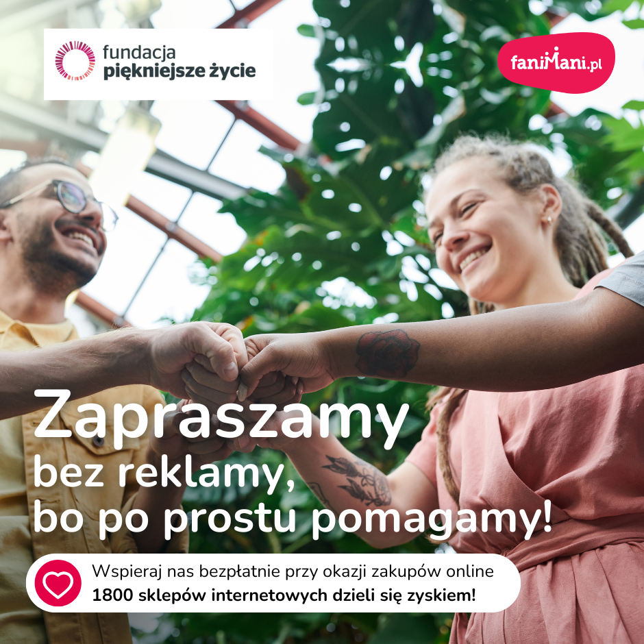 Po rejestracji zrób w ciągu roku zakupy przez internet za min. 100 zł z aktywną darowizną w jednym z 1805 sklepów, a Fundacja Piękniejsze Życie, otrzyma od FaniMani dodatkowe 2x5 zł darowizny!